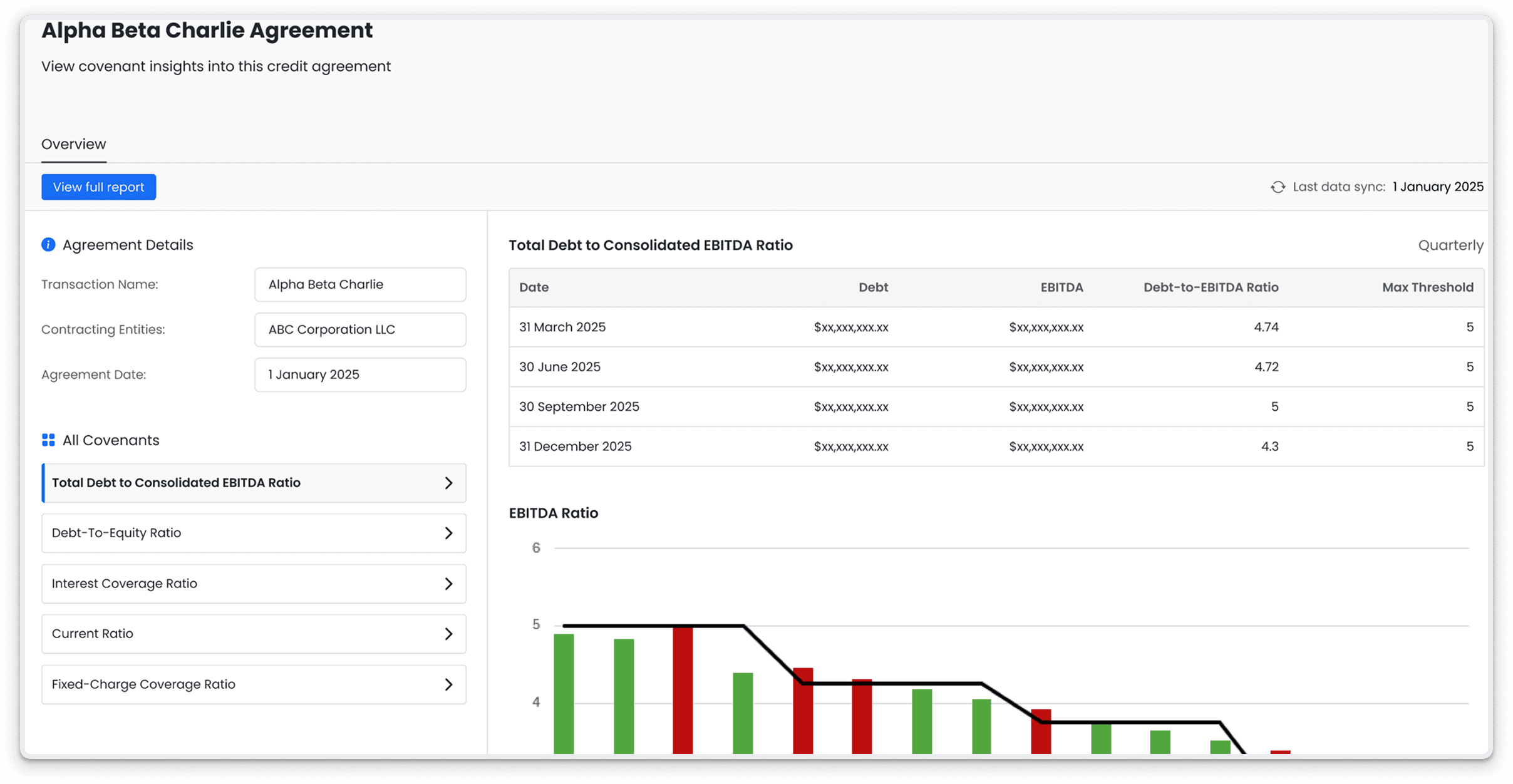 Track financial covenants in a centralized location with real-time data analytics to view trends over time
